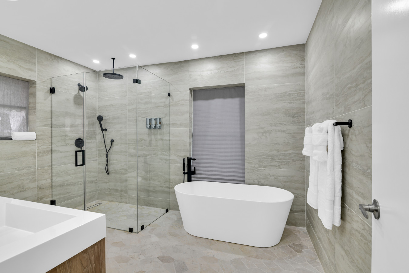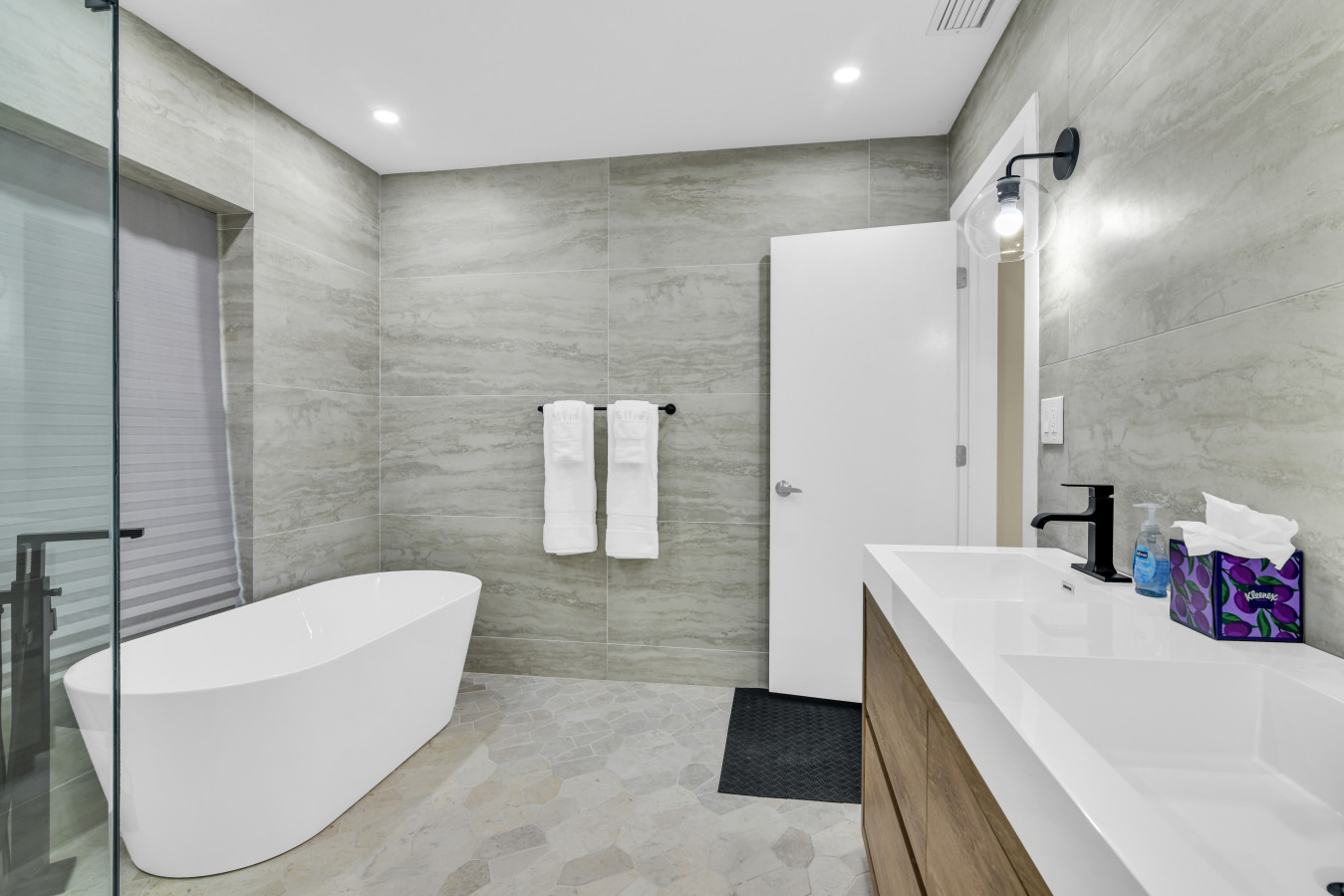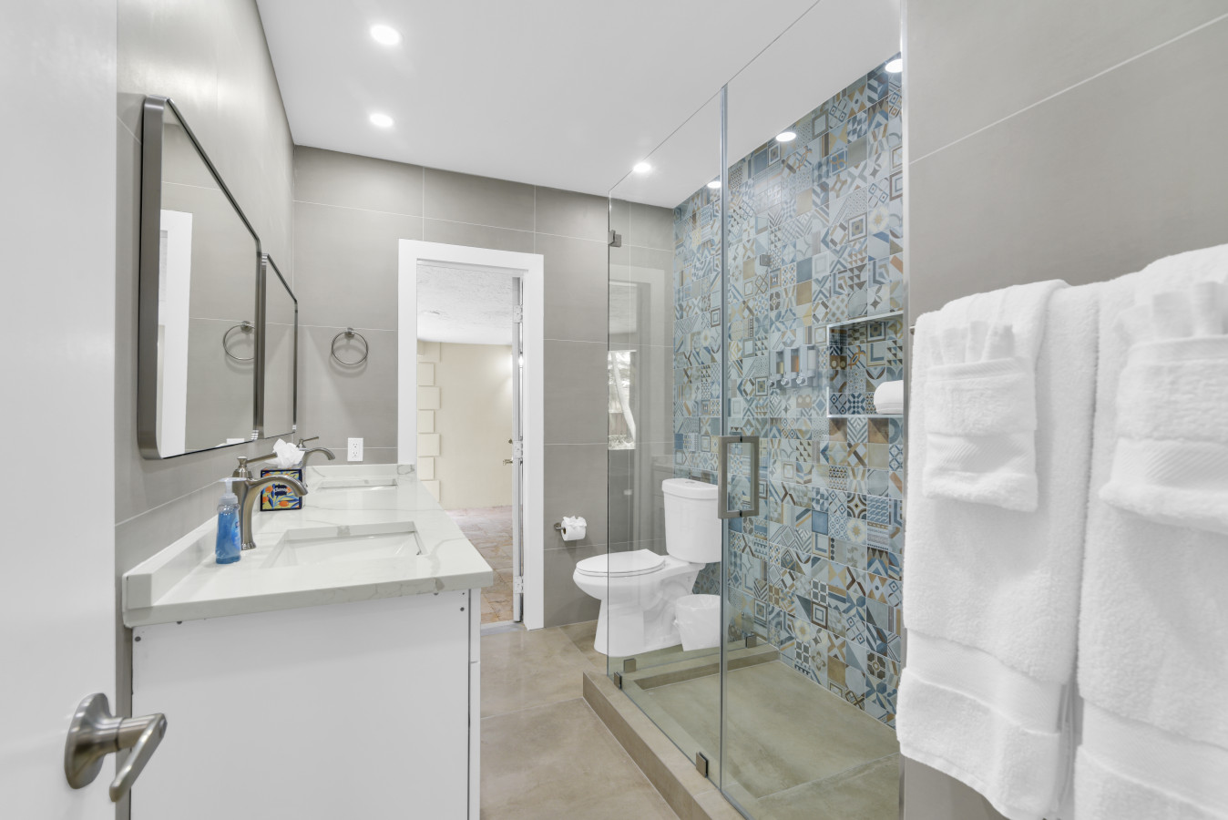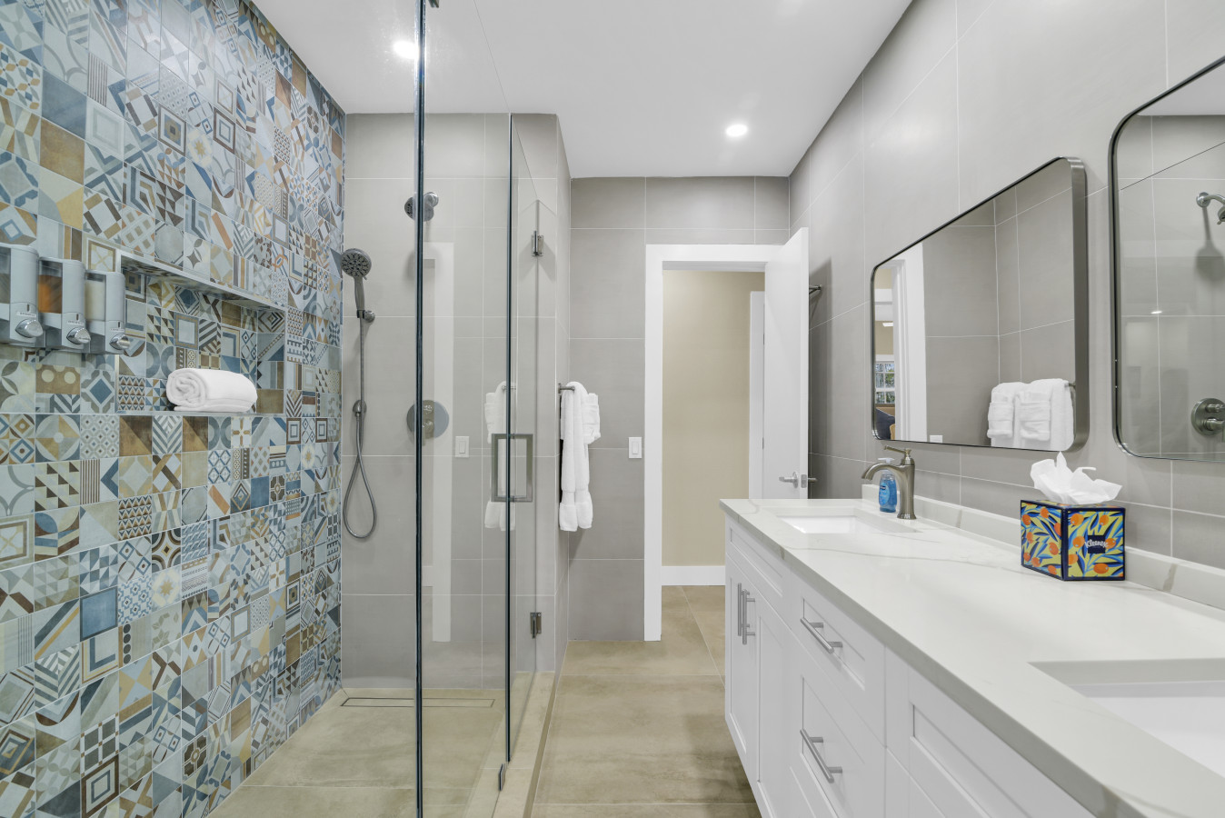 Hall Bathroom – Double sinks, shower, and direct access to the pool area.