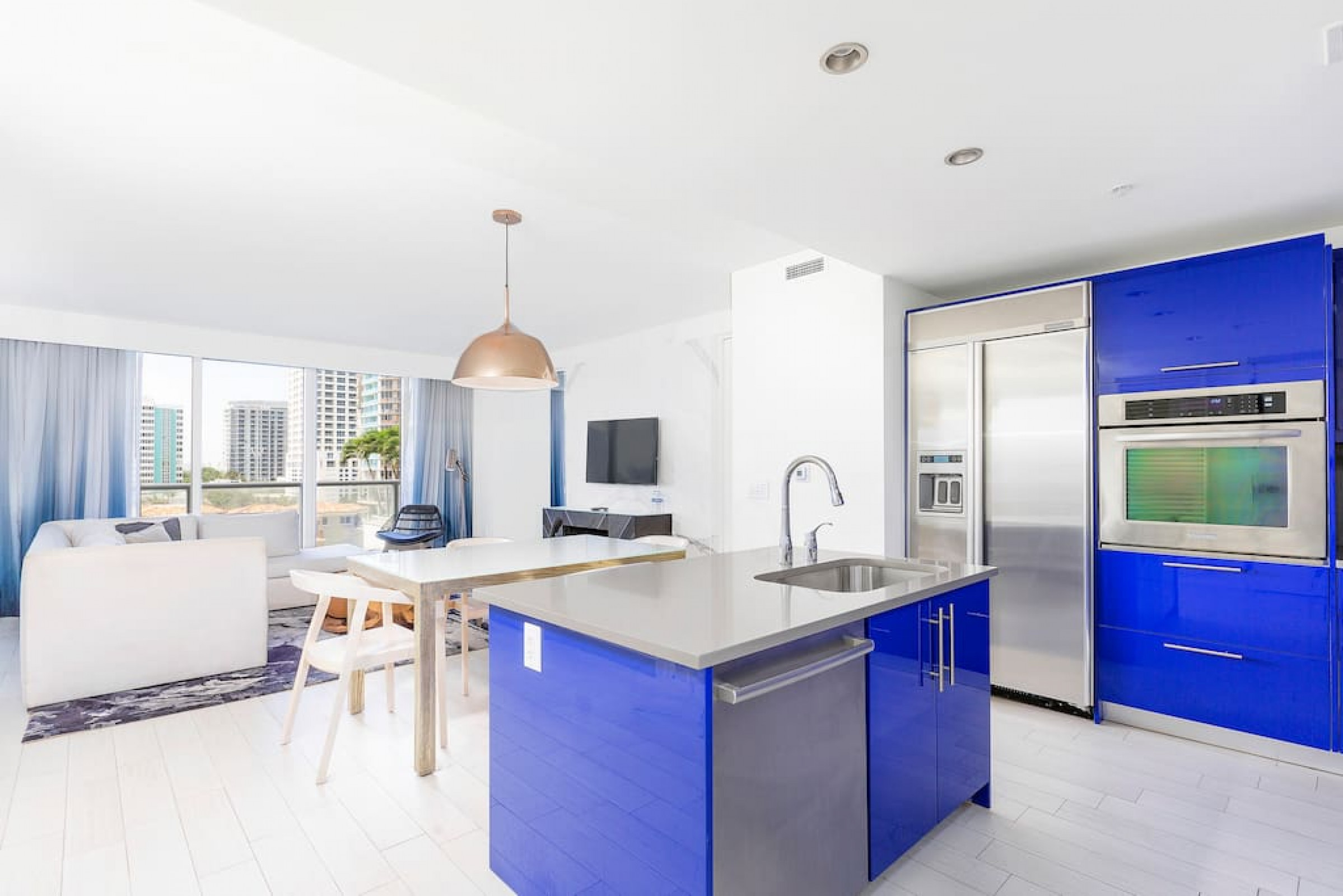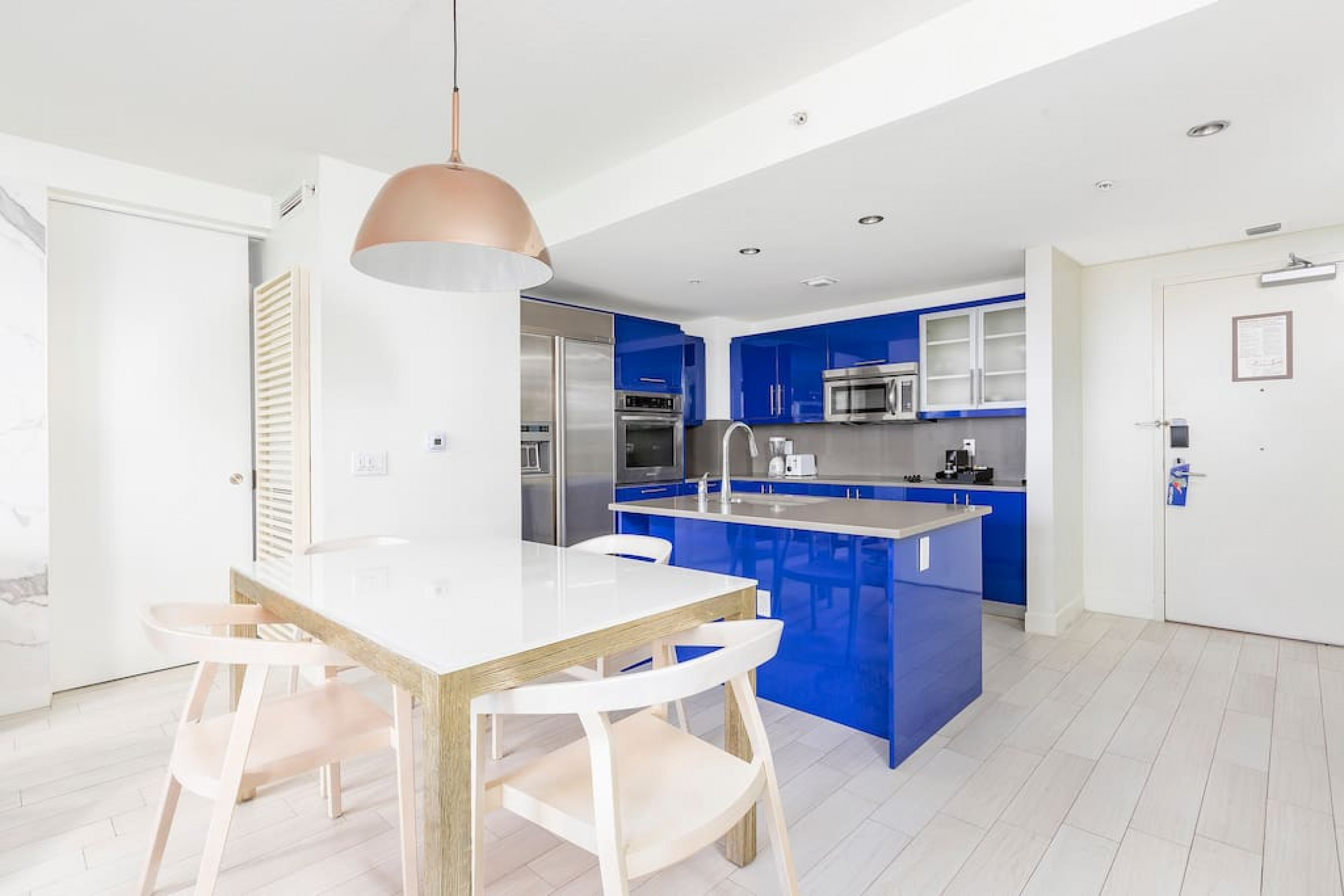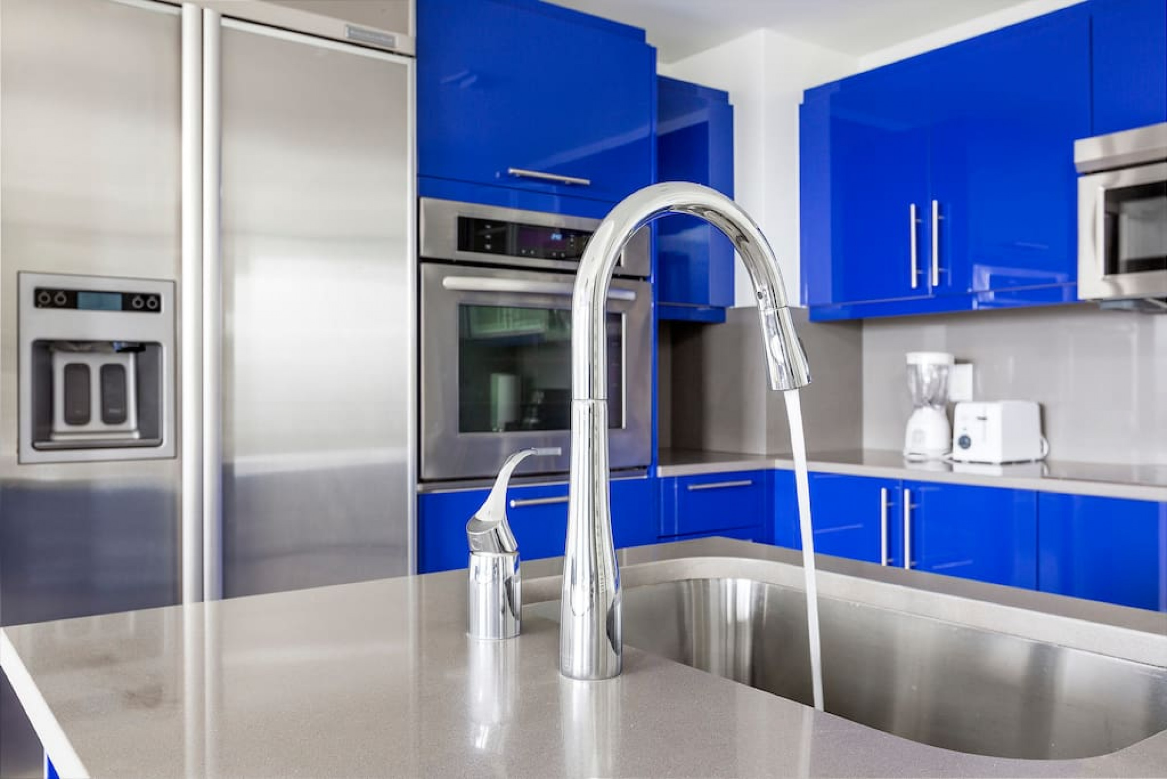 The iconic W Blue kitchen features Italian- designed cabinetry and polished designer stone countertops. It is fully equipped for your stay and features a dishwasher, garbage disposal, refrigerator, freezer, oven, microwave, coffee maker, toaster, blender, dishes, cutlery, cups, and glasses.