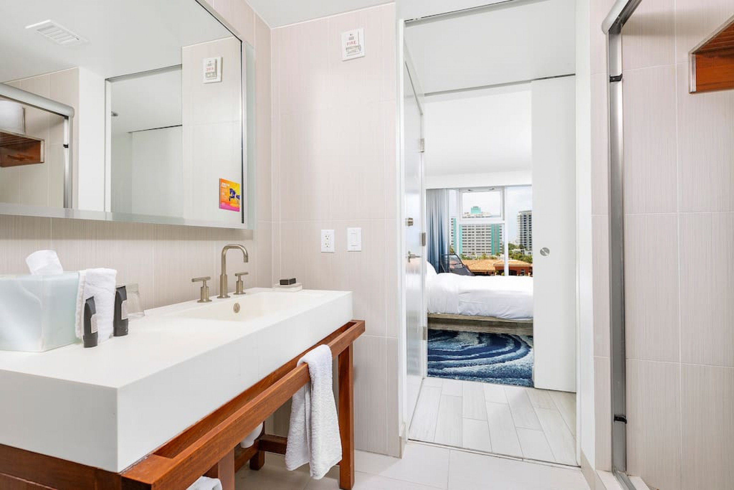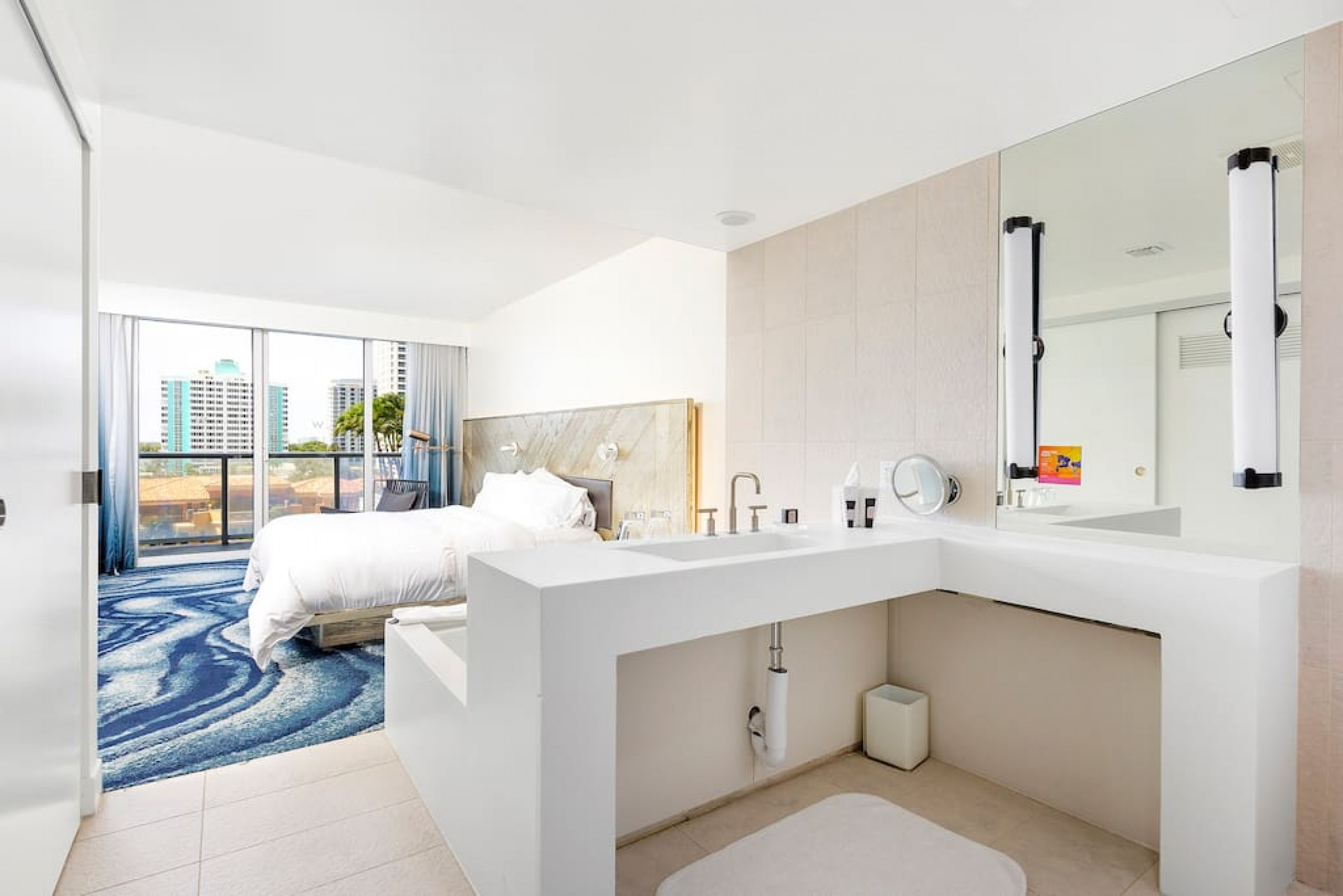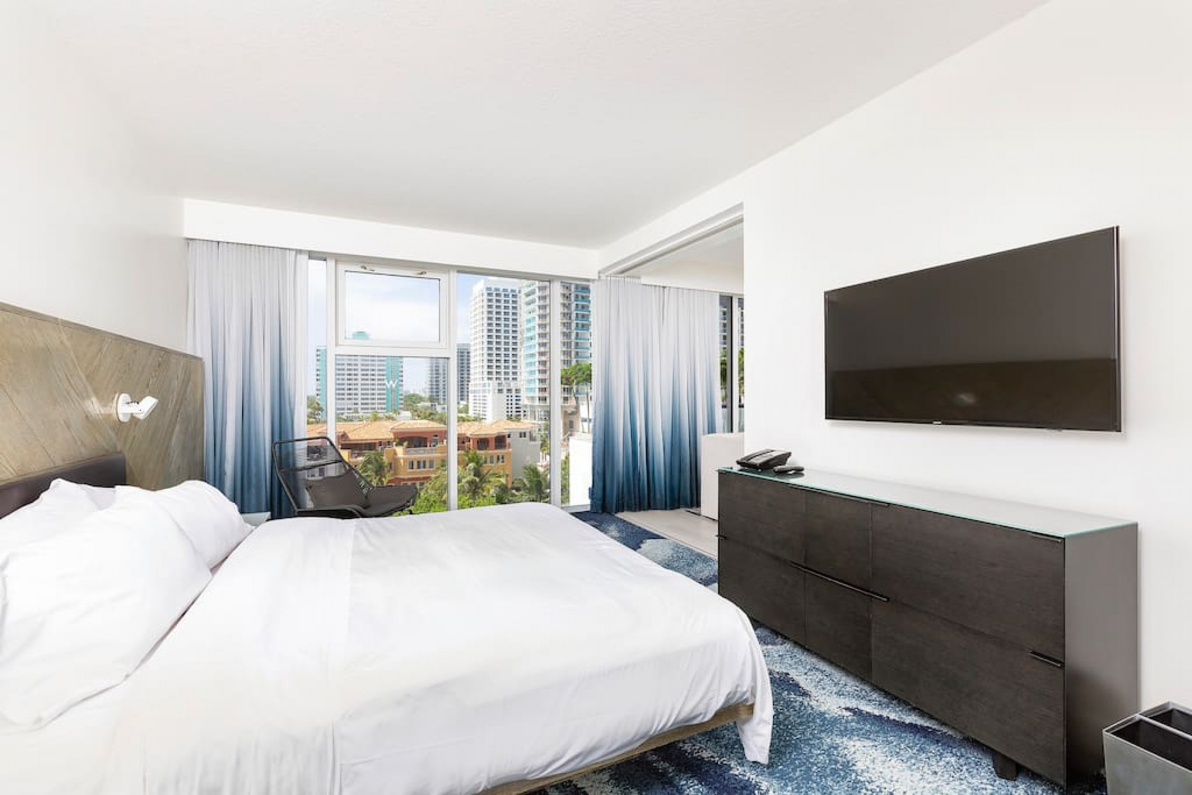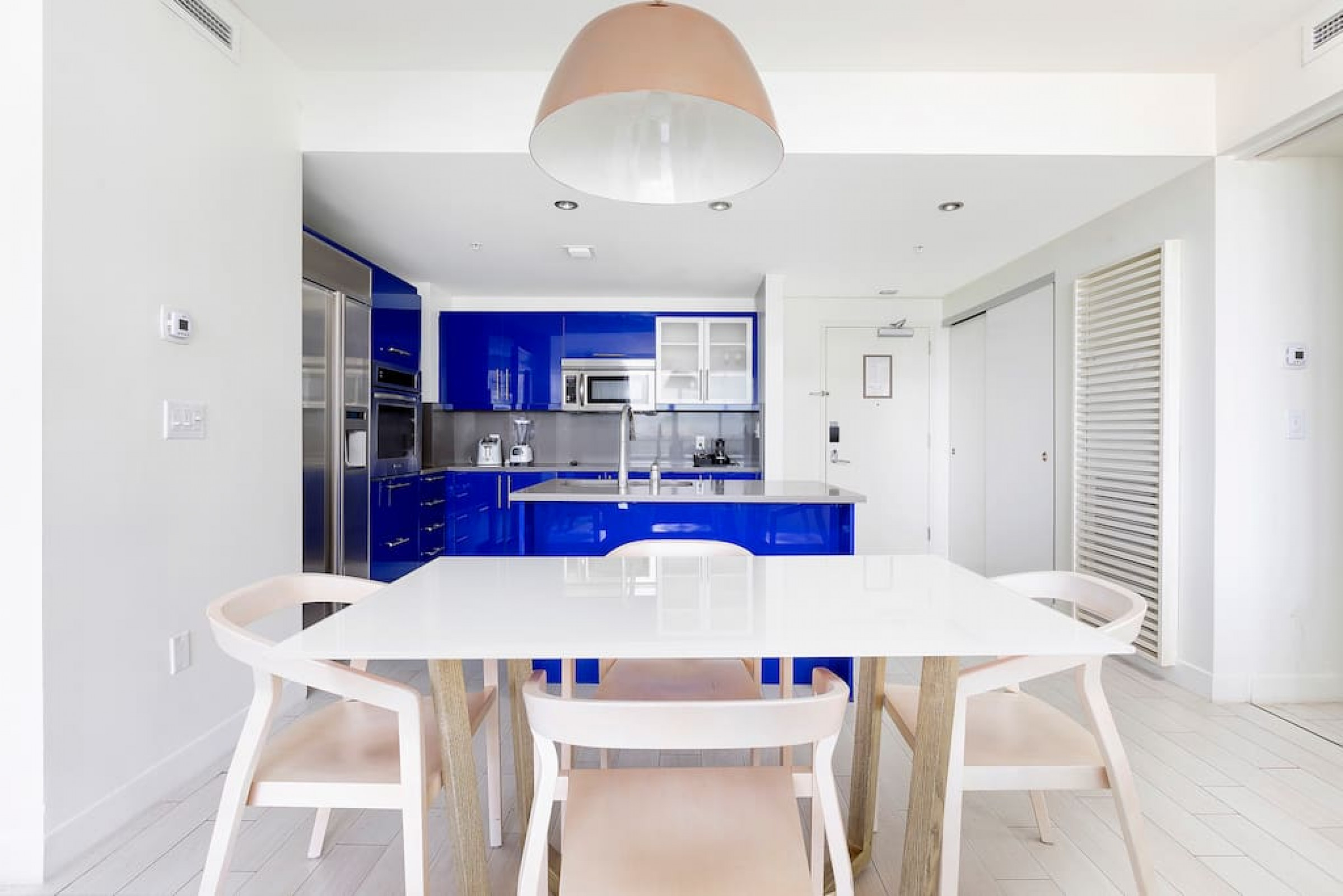 The iconic W Blue kitchen features Italian- designed cabinetry and polished designer stone countertops. It is fully equipped for your stay and features a dishwasher, garbage disposal, refrigerator, freezer, oven, microwave, coffee maker, toaster, blender, dishes, cutlery, cups, and glasses.