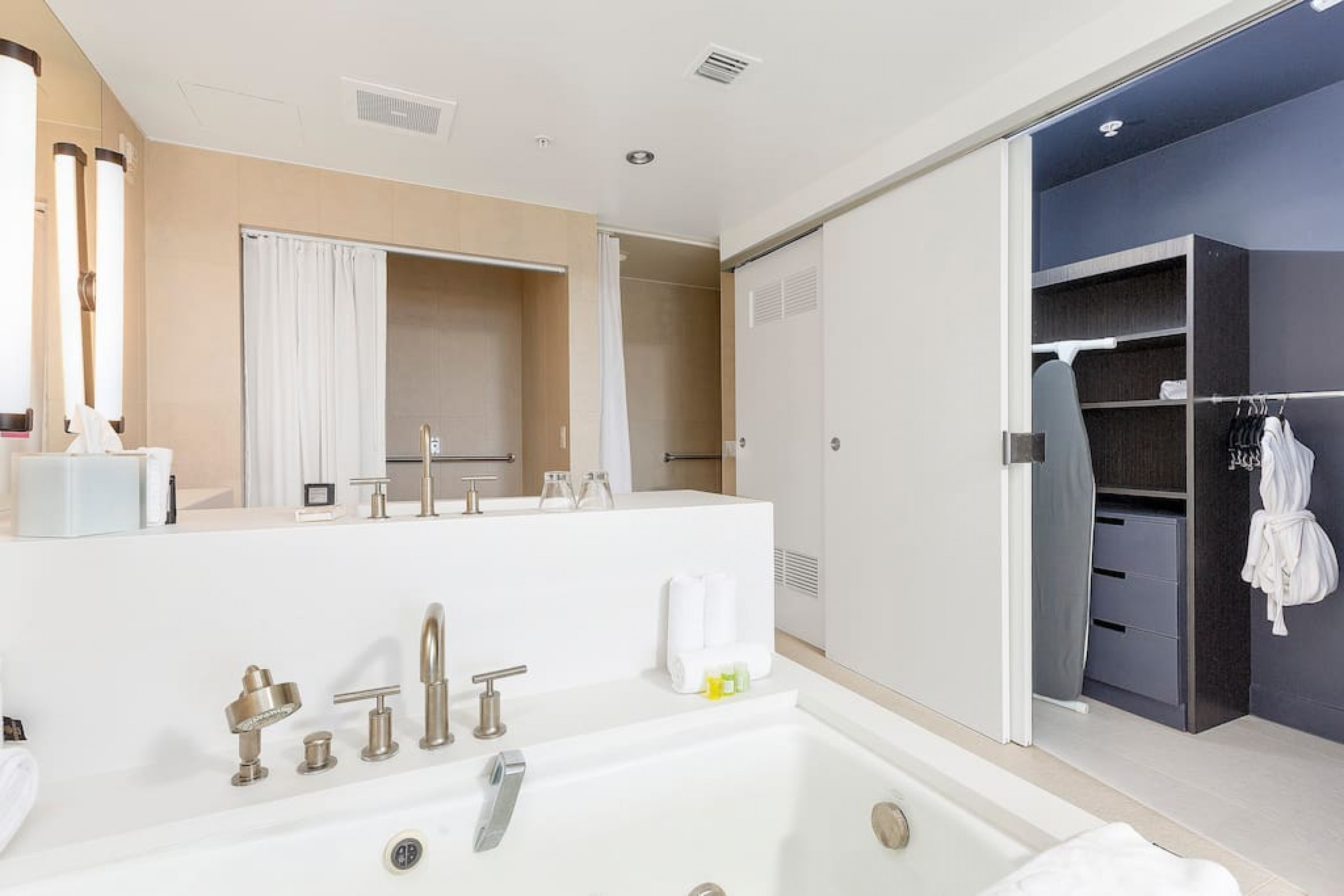 Master Suite has a stackable washer and dryer, iron, ironing board, and safe in the closet.