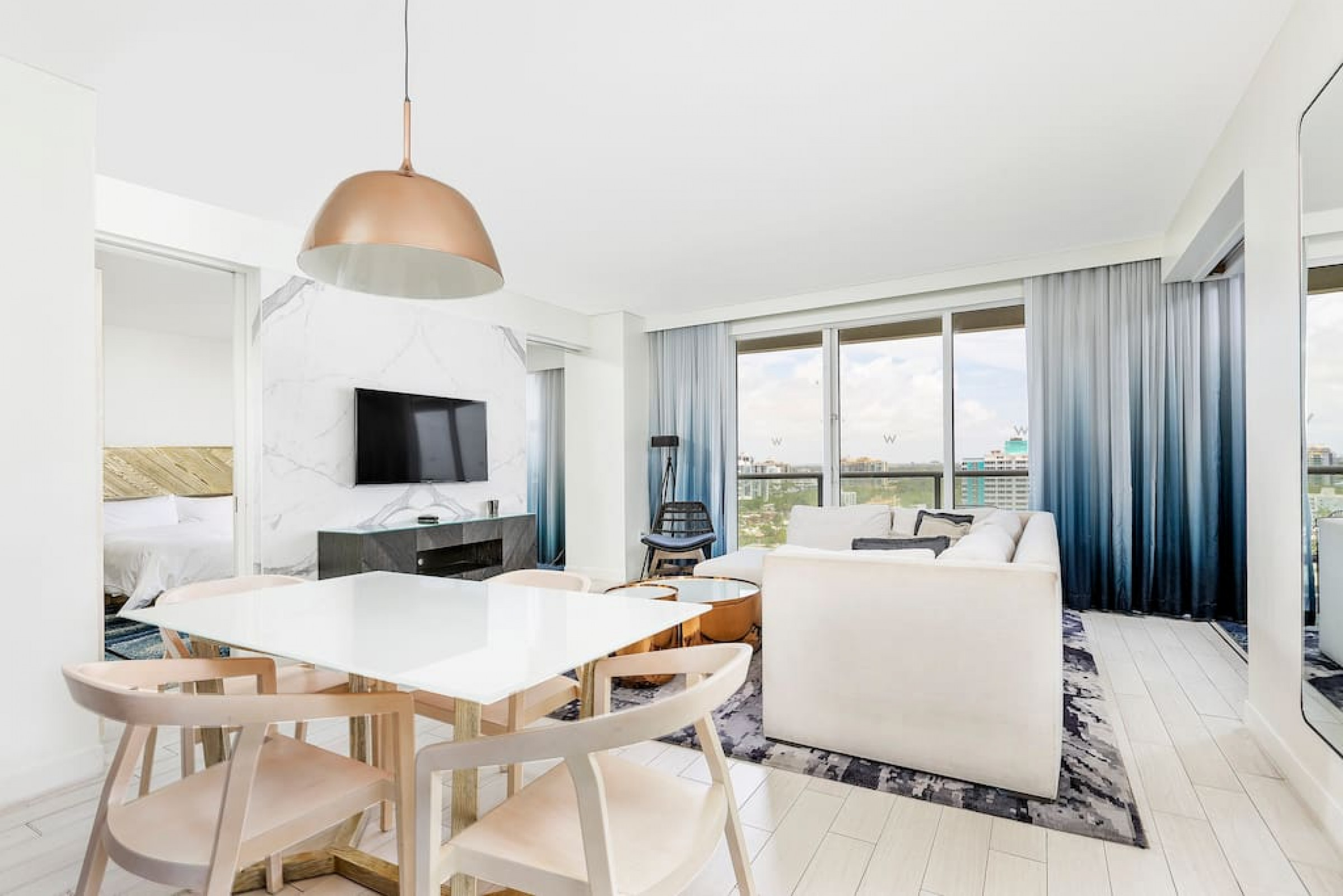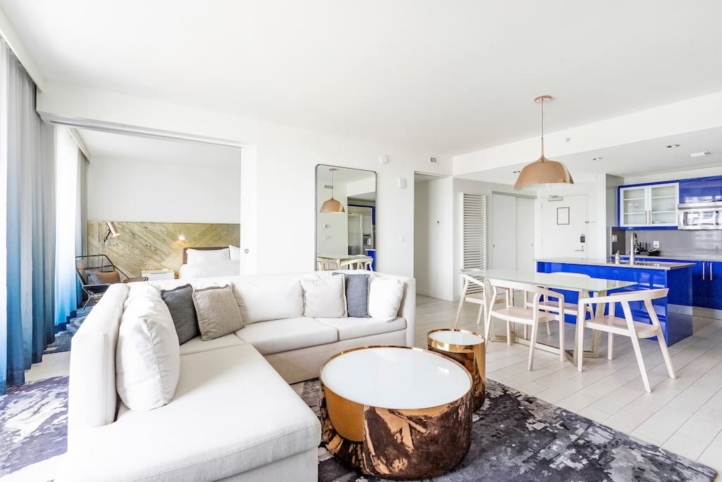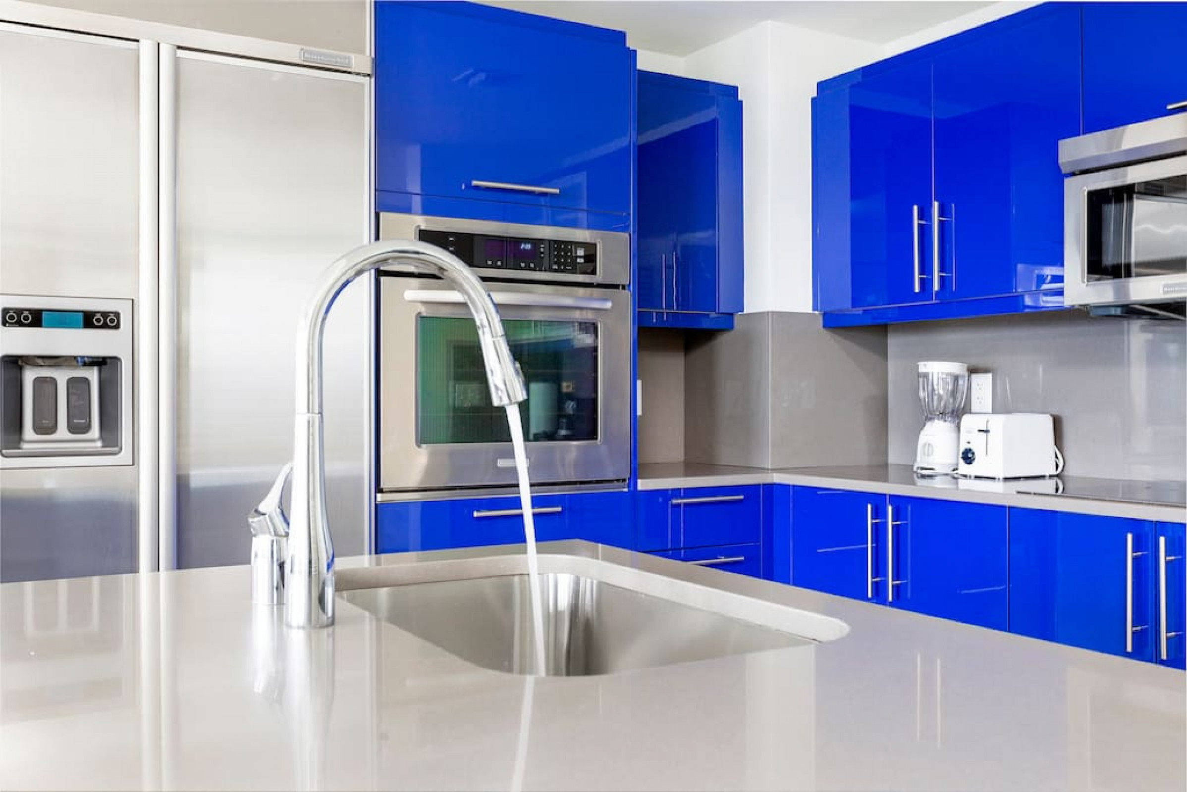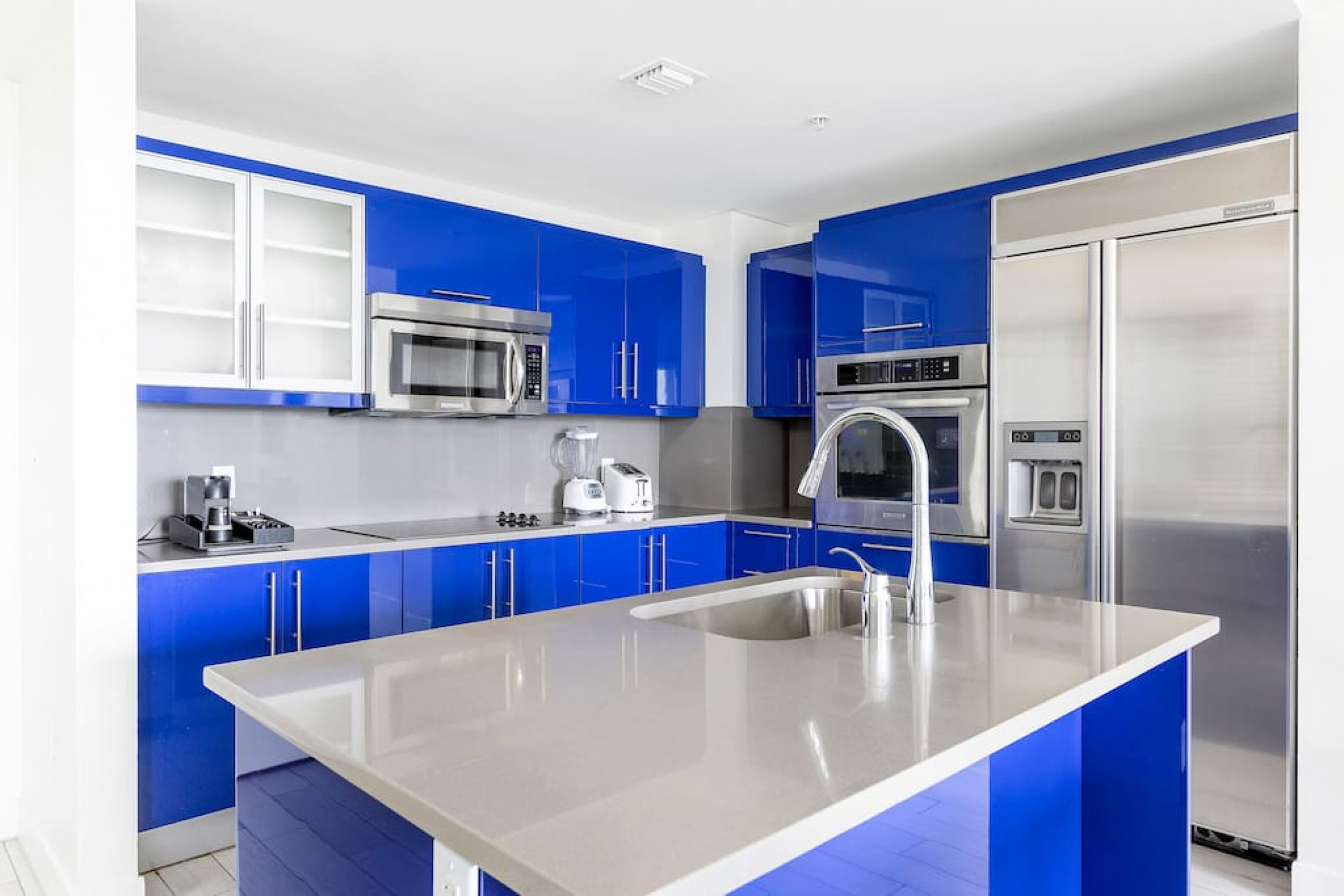 The iconic W Blue kitchen features Italian- designed cabinetry and polished designer stone countertops. It is fully equipped for your stay and features a dishwasher, garbage disposal, refrigerator, freezer, oven, microwave, coffee maker, toaster, blender, dishes, cutlery, cups, and glasses.