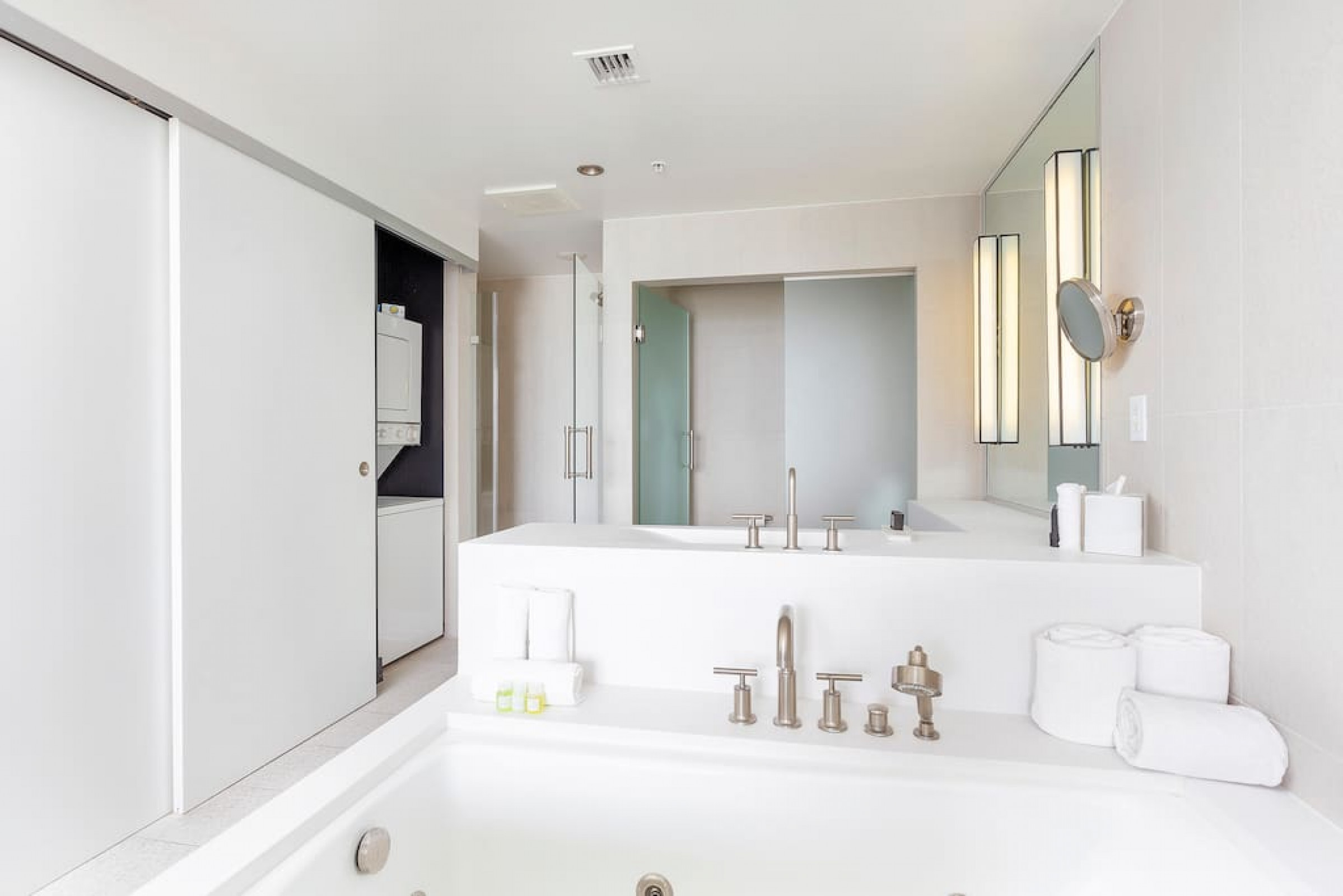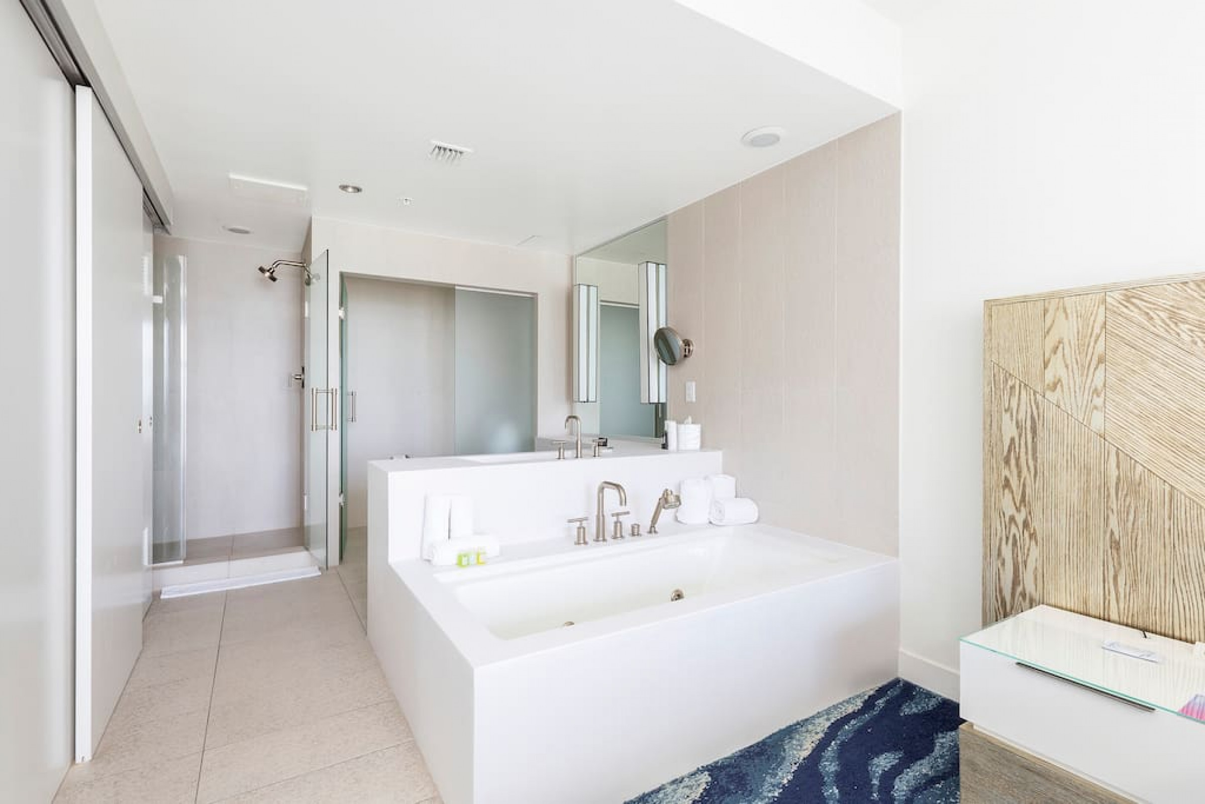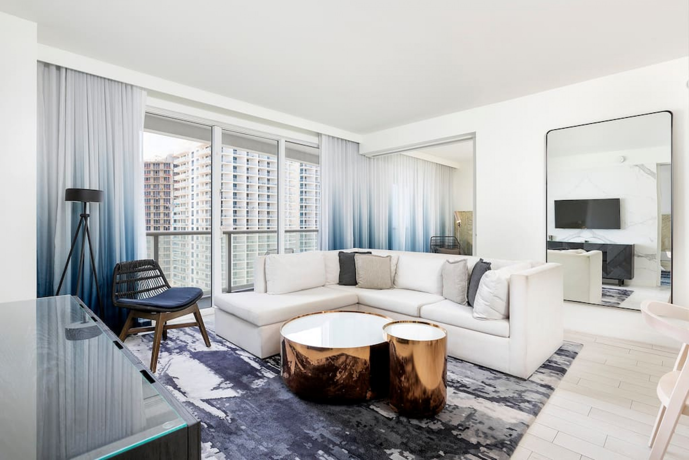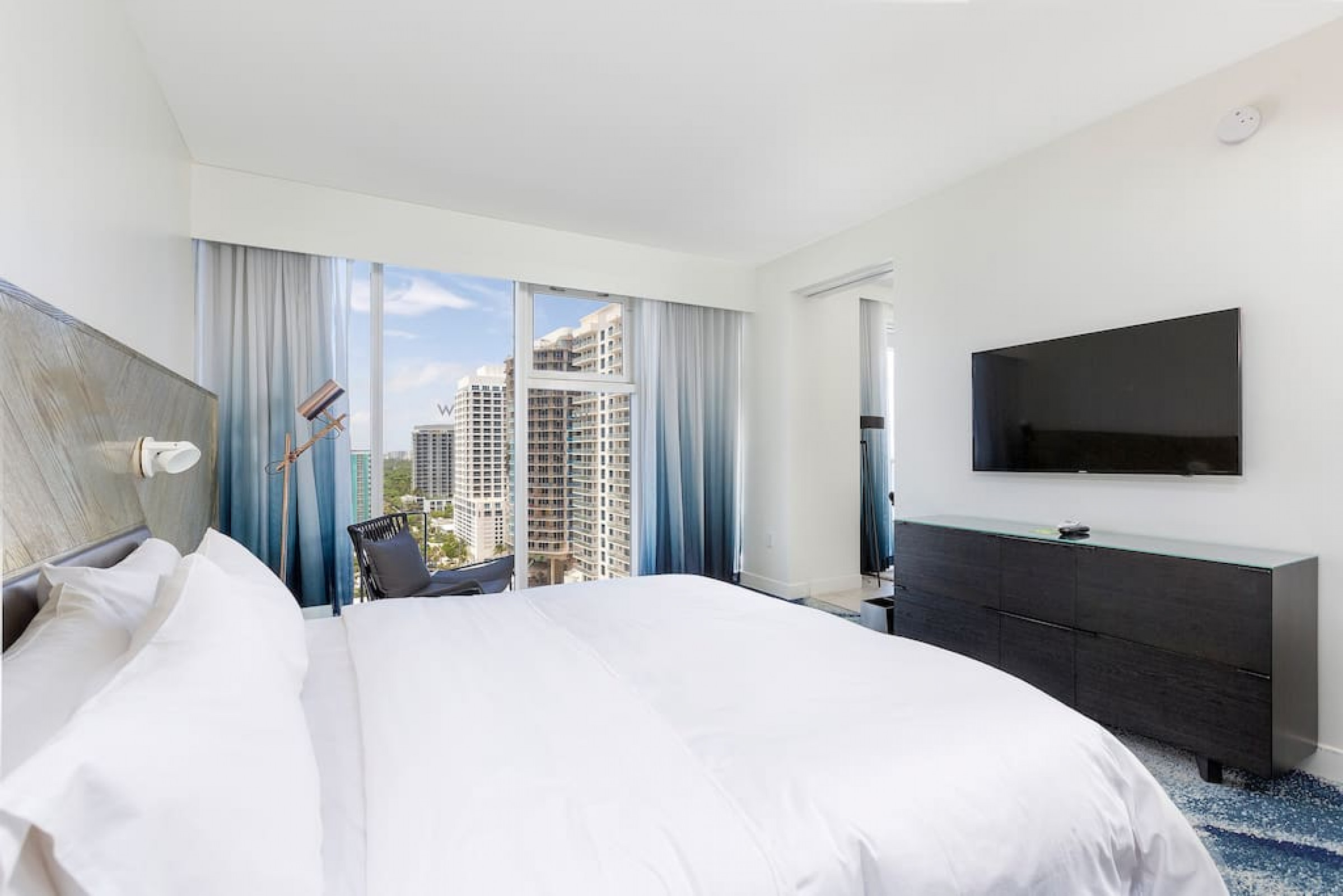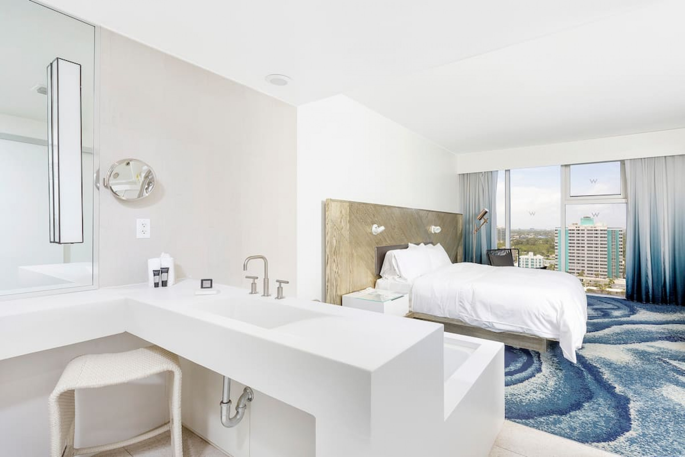 The iconic W Blue kitchen features Italian- designed cabinetry and polished designer stone countertops. It is fully equipped for your stay and features a dishwasher, garbage disposal, refrigerator, freezer, oven, microwave, coffee maker, toaster, blender, dishes, cutlery, cups, and glasses.