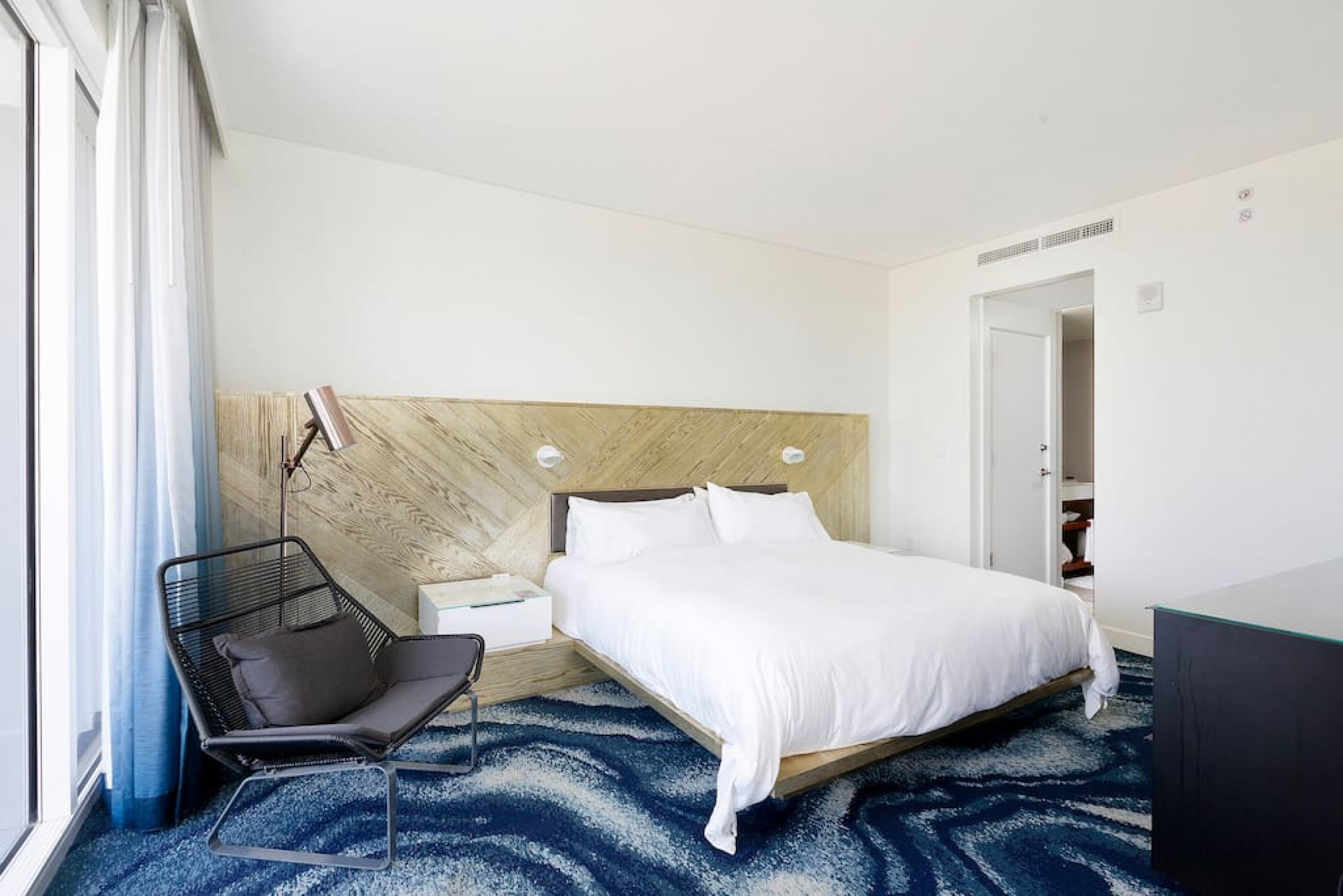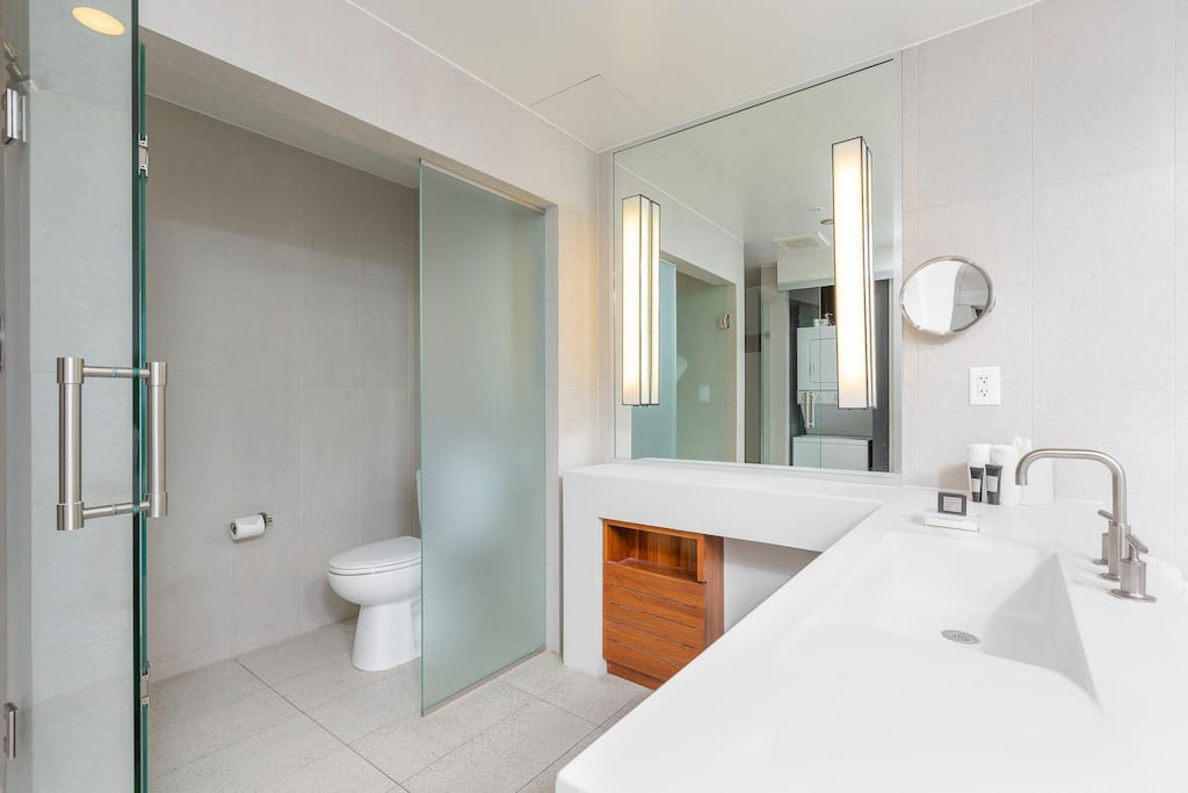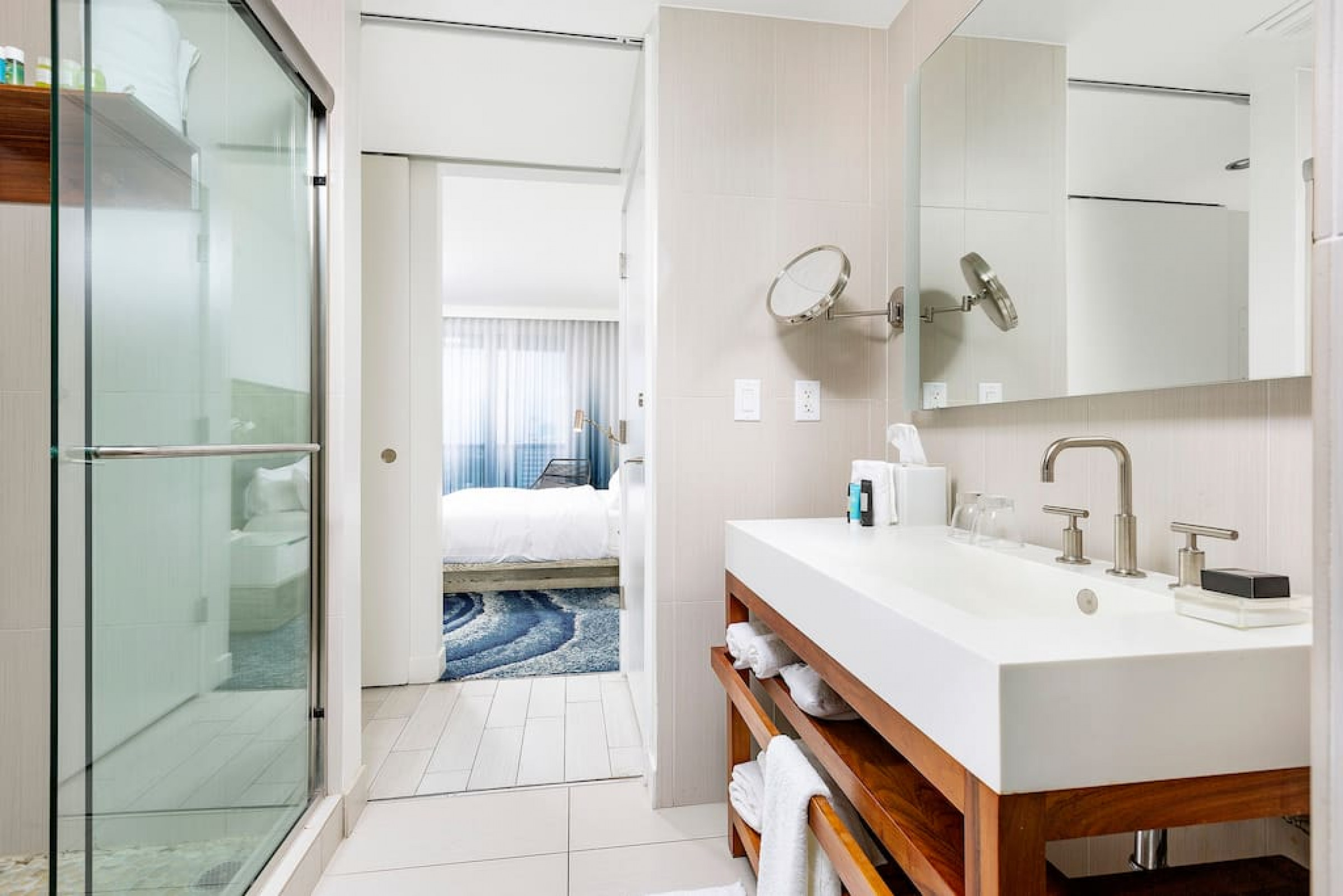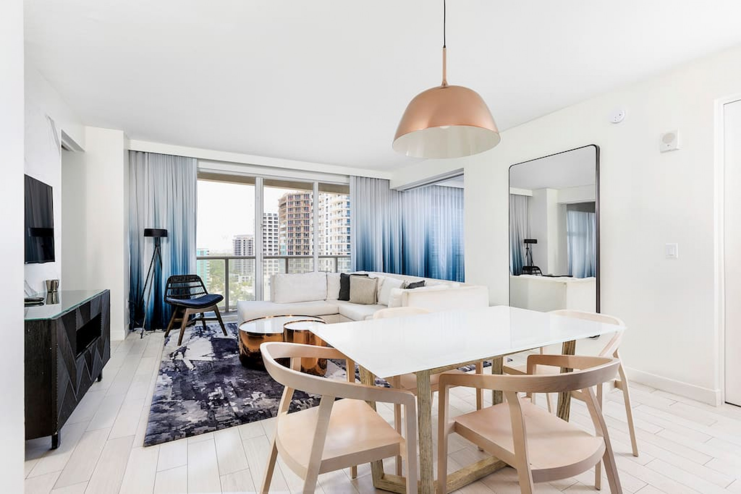 The iconic W Blue kitchen features Italian- designed cabinetry and polished designer stone countertops. It is fully equipped for your stay and features a dishwasher, garbage disposal, refrigerator, freezer, oven, microwave, coffee maker, toaster, blender, dishes, cutlery, cups, and glasses.